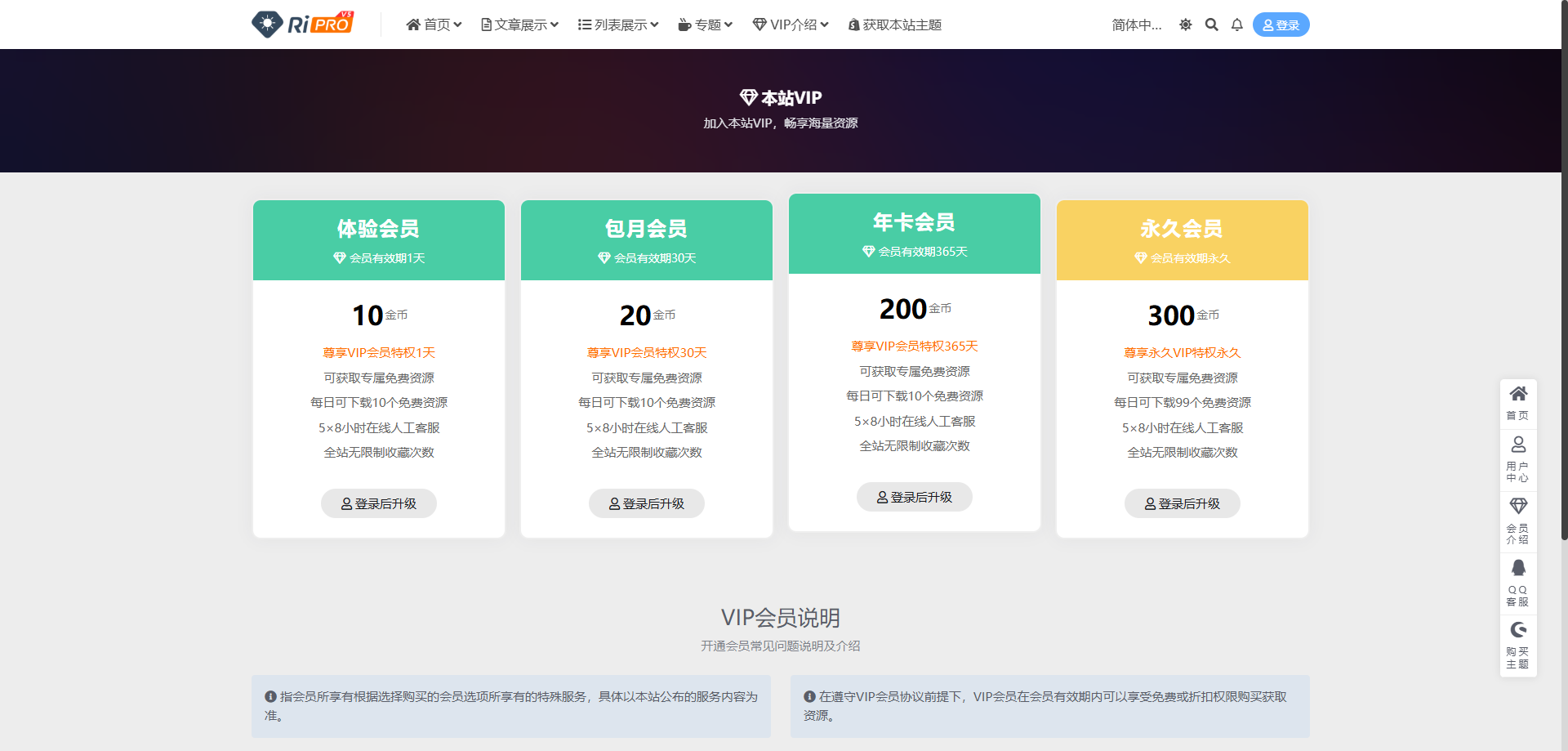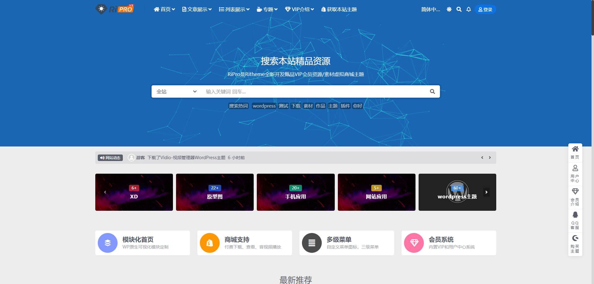 RiPro主题全新V5版本(原RiPro-V2升级版),是一个优秀且功能强大、速度极快,易于管理、现代化的WordPress虚拟资源商城主题。支持首页模块化布局和WP原生小工具模块化首页可拖拽设置,让您的网站设计体验更加舒适。同时支持了高级筛选、自带会员生态系统、超全支付接口等众多功能,无需依赖插件即可实现。此外,主题还支持卡密、充值、站内币、会员、推广佣金、统计、自定义币种、自定义会员标识、支持自定义SEO信息等多种功能,为您的网站提供更加完整的解决方案。